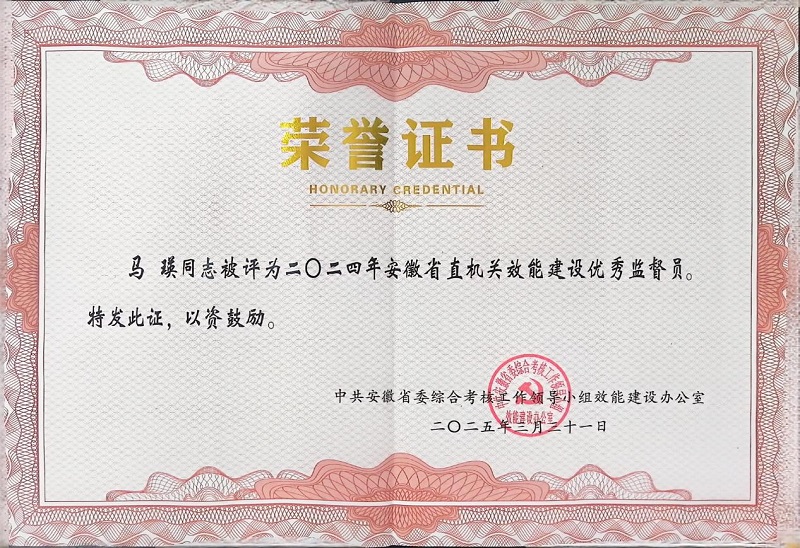 马瑛同志获评安徽省直机关效能建设优秀监督员