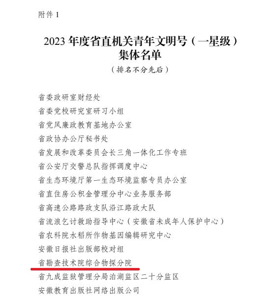 近日,2023 年度省直机关青年文明号评选结果揭晓,我院综合物探分院光荣上榜,被共青团安徽省直属机关工作委员会命名为2023年度省直机关青年文明号(一星级)。