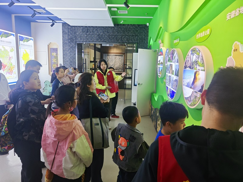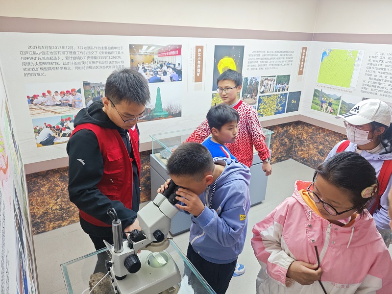 在陈列馆内,志愿者依托丰富的馆藏资料,从四大铁矿会战到探明沙坪沟钼矿,以“时空走廊”形式生动讲解我省找矿历程。志愿者结合岩芯标本、大型沙盘等展品,讲述了地质运动与矿产资源赋存的内在关联。学生们认真观察着历经亿万年形成的各种岩矿石,直观感受“地下安徽”的壮丽之美。
