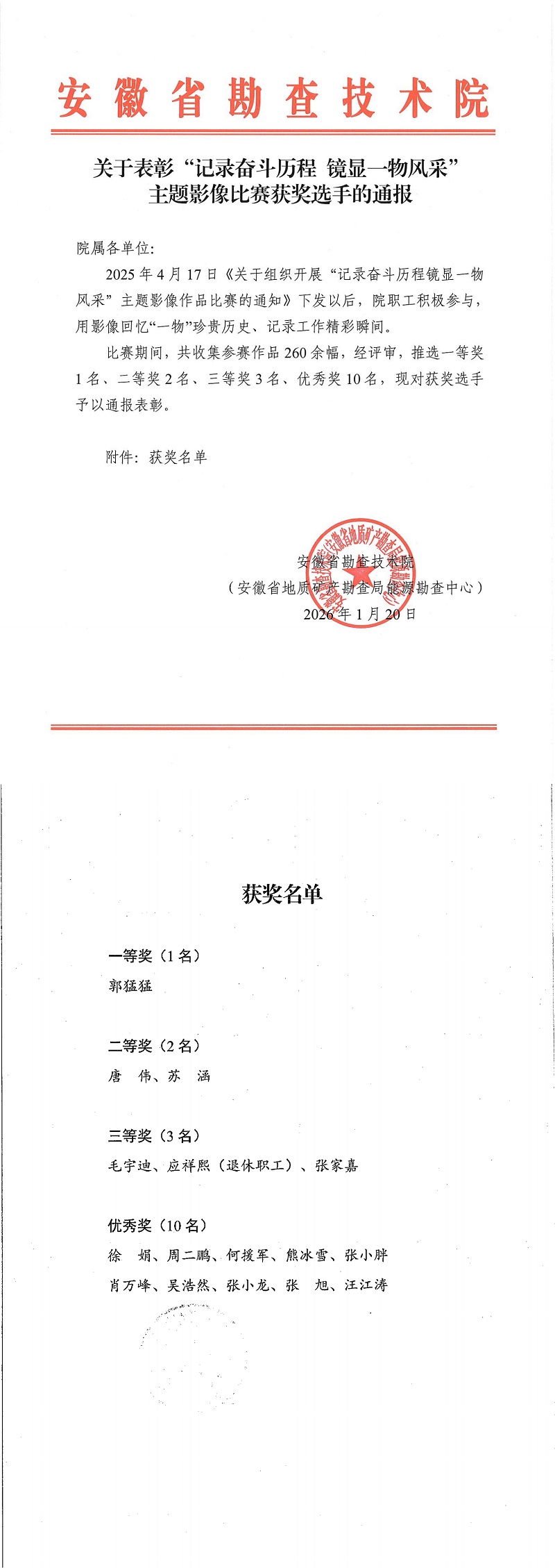 关于表彰“记录奋斗历程 镜显一物风采”主题影像比赛获奖选手的通报