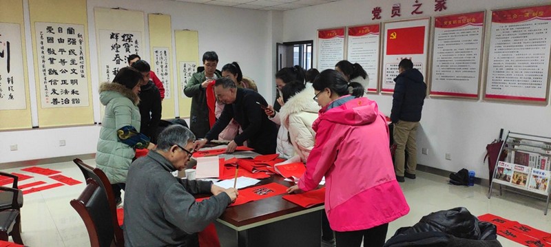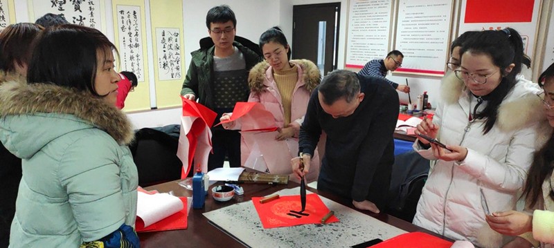 活动当日,大家齐聚一堂,场面热闹非凡!大家选好心仪的对联,簇拥在书法老师周围,或仔细端详、或牵纸送墨,或耐心等待,还有有的守着已经书写好的春联一边等待晾干,一边诵读欣赏?;疃恢背中较挛?点半左右才落下帷幕。