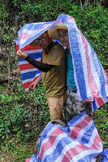 南国的天气说变就变。傍晚时分,刚才还是火烧火燎的天霎那间变得雾气腾腾——这是大雨即将降临的迹象。张鹏立马关掉发电机对着对讲机大声呼叫:“收线!所有小组人员收线,在大雨来临前把线收掉,”一声令下大家像猛虎下山一样忙活起来。