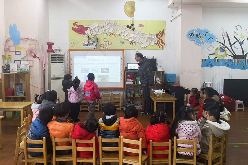 课堂上,郭猛猛利用丰富的视频等多媒体资料为小朋友们介绍了无人机的结构、类型及功能??破栈疃?,小朋友们始终充满好奇,热情高涨。课后,我院无人机团队还进行了室外演示性飞行,并协助幼儿园完成新年祝福视频录制工作。