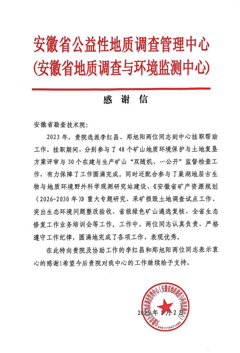 近日,我院收到安徽省公益性地质调查管理中心发来的感谢信,对我院以及在中心挂职的李红昌、郑旭阳两位同志表达诚挚的感谢。