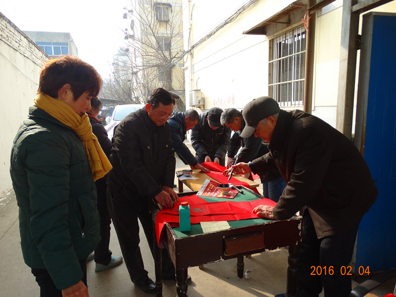 2月4日下午,合肥地矿家园小区内,院纪委书记李东海及张永德、穆晓红、苏根波、戴传慧、何援军等爱好书法的在职、退休职工为广大业主现场免费写“?!弊趾痛毫?。