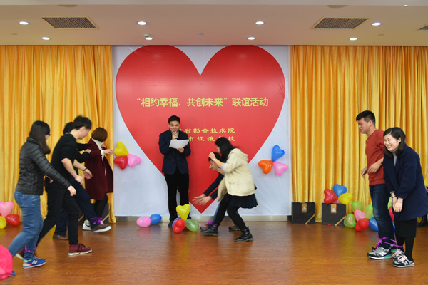 在小伙子和姑娘们相互介绍了自己的简单情况之后,别开生面的趣味游戏开始了?!凹访寂鄢员伞?、“定点投球”、“你来比划我来猜”、“绑腿猜歌名”、“终极三连环”……一个个妙趣横生的游戏,拉近了男女青年们之间的距离,使大家伙儿摆脱了局促,展现了自我。现场气氛火热浪漫,每位青年或欢声笑语,或窃窃私语,或开怀大笑,大家无拘无束,尽情欢乐。