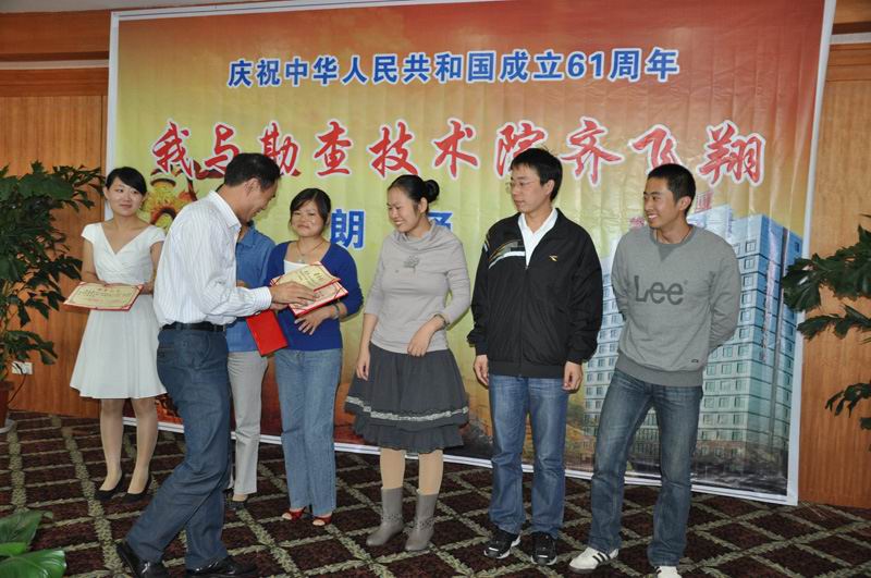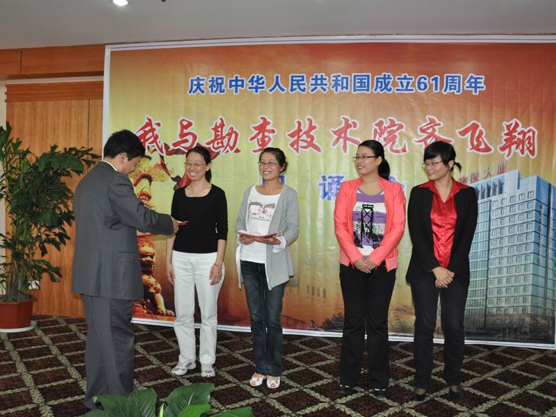 9月30日,院工会、团委在蚌埠怀洪宾馆举办“我与勘查技术院齐飞翔”朗诵比赛,在纪念建国61周年的喜庆气氛中,30多名青年职工满怀激情朗诵了诗歌、散文等作品,抒发热爱祖国、热爱地质事业、热爱勘查技术院的火热情怀,表达共创勘查技术院美好未来的信心和决心。党委书记李晓荣在赛后讲话中对这次极富励志意义的活动给予了高度评价,希望年轻同志与全院职工携手并肩,共同谱写勘查技术院未来发展的美好篇章。战双庆、许传建、刘银山等院领导观看了朗诵比赛并为获奖选手颁奖。(工会 党办)