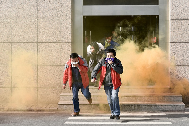 此次演练模拟场景为该院科研业务楼发现火源,浓烟和火苗冒出,多人被困楼内?;鹪址⑸螅贝χ弥富硬苛⒖汤煜谰?,同时发出疏散广播通知。听到消防警报后,楼内全体职工迅速用湿毛巾捂住口鼻,俯低身体,迅速有序地从消防通道紧急撤离至院内操场。操场上,刘任还就自救呼吸器、灭火器等消防器材的使用进行了演示讲解。职工实际操作了灭火器的使用。