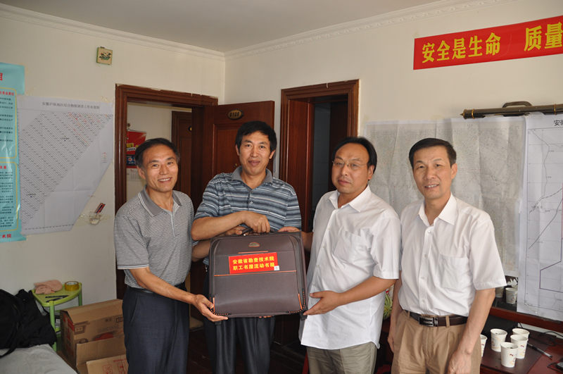 8月2日,院党委书记李晓荣在工会主席刘银山、党办主任毛思斌、安??瓶瞥し胂蚨鹊呐阃?,驱车来到庐江县能源分院《安徽庐枞地区综合物探调查》重力项目组慰问野外一线职工,为他们送去防暑降温用品并赠送“流动书箱”,使他们在炎炎夏日感受到一丝清凉的同时更丰富了业余文化生活。