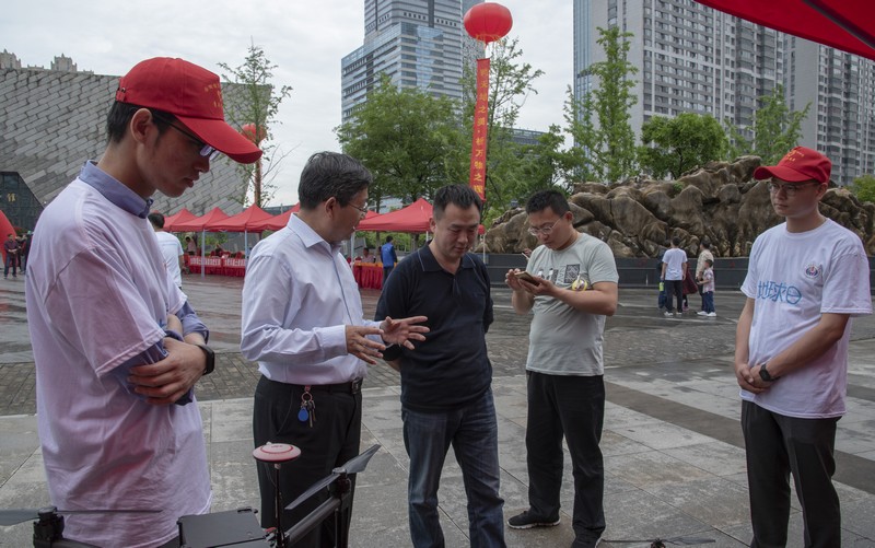 在广场主题活动现场中,无人机吸引了大批市民,特别是小朋友好奇的目光。我院志愿者们讲解了利用无人机技术在地质灾害监测预警方面的应用实例,以及如何为环境和灾害监测预警提供可靠依据。通过实际操作使用罗盘仪,市民们了解了如何测定距离、水平、高差、坡角等常识。