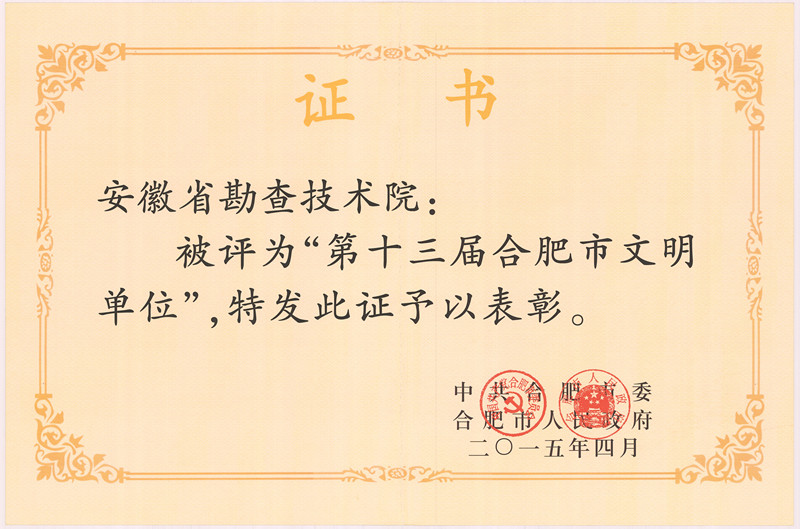 近日,合肥市委、市政府发布《关于命名表彰第三届文明村镇和第十三届文明单位的通报》(合〔2015〕61号)文件,对在推动全市精神文明建设健康深入发展中取得突出成绩的先进典型进行表彰,我院榜上有名,这是我院首次申报便成功获得合肥市文明单位荣誉称号。