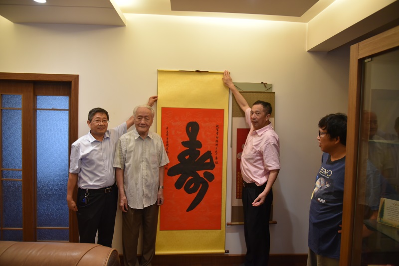 许传建一行为常印佛院士送上祝寿书法作品,共同祝愿常印佛院士健康长寿。谈话间,常印佛院士询问了解了我院近期工作情况,回顾了与“一物”领导专家合作共事的往事,并对我院未来发展寄予殷切希望。