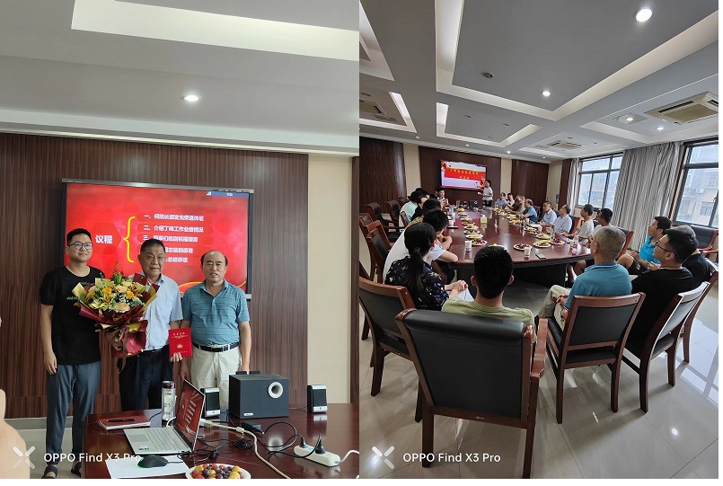 欢送会上,何家国为丁峰同志颁发光荣退休证,丁浩代表地调分院献上了充满敬意的鲜花。徐标通过老照片及获奖证书展现了丁峰同志的主要工作经历、业绩情况;代表地调分院党支部和分院领导班子充分肯定了“丁峰同志在41年的工作中,求实严谨、兢兢业业,把自己的青春和力量无私地奉献给了一物,把自己的工作热情和智慧奉献给了钟爱的地质事业,为一物化探工作做出了突出成绩;他细心教导,耐心指导,为年轻技术人员的成长甘做铺路石;他严于律己,关心同事,践行共产党员的初心和使命,是我们学习的榜样!”