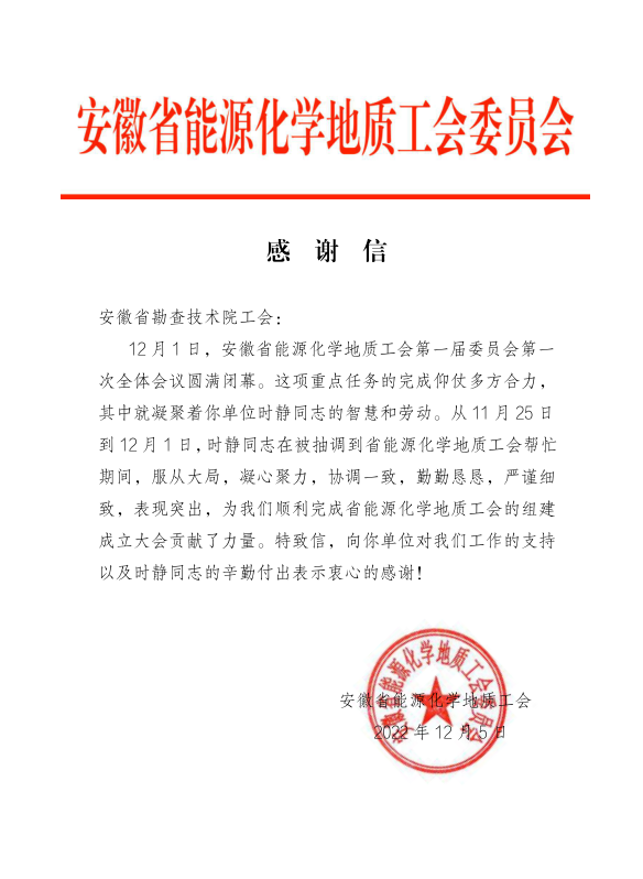 近日,省能源化学地质工会向院工会致感谢信,感谢我院工会对省能源化学地质工会工作的支持,并专门对抽调参加省能源化学地质工会组建成立大会工作的我院职工时静同志提出表扬。