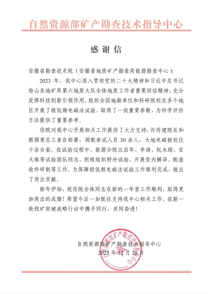 近日,我院收到自然资源部矿产勘查技术指导中心的感谢信,对我院在极低频电磁法试验工作中做出的突出贡献表示感谢。