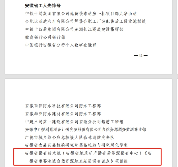 4月28日,从安徽省劳动竞赛委员会、安徽省总工会获悉,综合物探分院《安徽省重要流域自然资源地表基质调查试点》项目组荣获安徽省工人先锋号荣誉称号;地震勘探分院陈同刚同志获安徽省劳动竞赛先进个人(安徽省五一劳动奖章)荣誉称号。