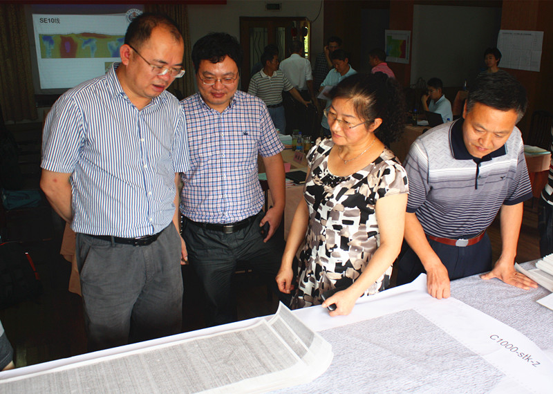 安徽省页岩气开发有限公司董事长兼总经理刘亚成(左一)、项目验收组组长楼基胜(右一)查看项目数据处理资料