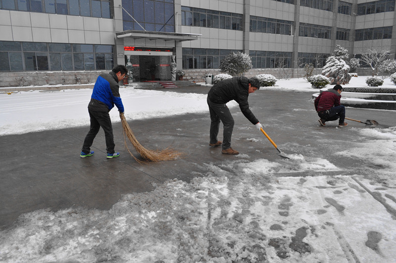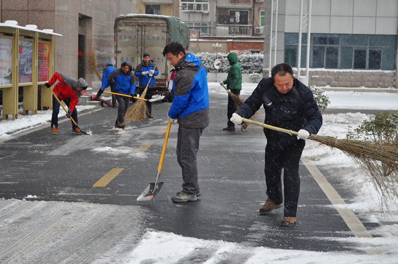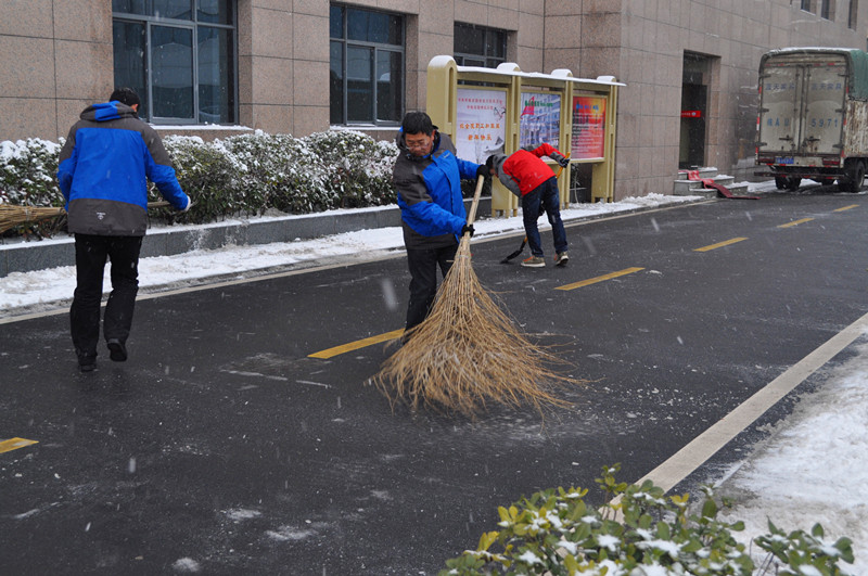 为保障广大干部职工出行安全,11月28日一大早,院长许传建、副院长汤正江和纪委书记李东海带领后勤服务中心、院办公室、安??频瓤剖也棵诺母刹恐肮?,在办公楼区域开展积雪清扫工作。他们有的用笤帚清扫,有的拿着铁锹铲雪。此时天空仍然纷纷扬扬飘着雪花,天气也格外寒冷,大家的双手和脸都冻得通红,一不小心雪水就从鞋帮里渗进去,弄湿了鞋袜,却丝毫没有影响大伙儿的干劲。