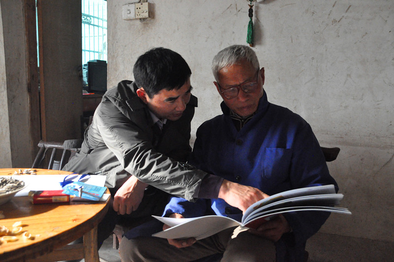 退管办工作人员王吉勇向曾素梅讲解联系卡信息