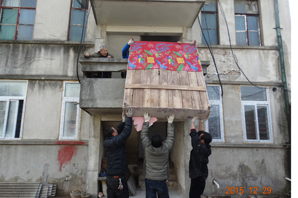 老职工们的家具多都是几十年前找木匠手工打的实木家具,搬起来可不是一般的沉重,可把这帮“壮劳力”给累坏了。如果只是重些倒还罢了,最难的是家具进楼房。许多家具从平房搬出来容易,可要搬到楼房中,受到楼梯、门宽等条件限制,让了空间却使不上力气,搬得稳了却挪不进去,着实让人费了不少心思。大家一起出主意,想办法,横着不行就竖着,直着不行就斜着。其中有一户的床,实在太大,连楼梯都进不去,最后大家找来绳子,硬是费了九牛二虎之力从平台拉上去的。