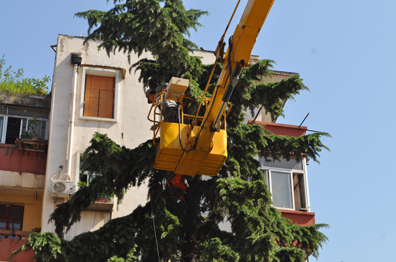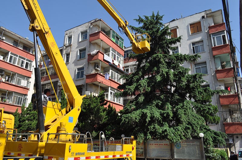 工作人员正在悬挂彩灯