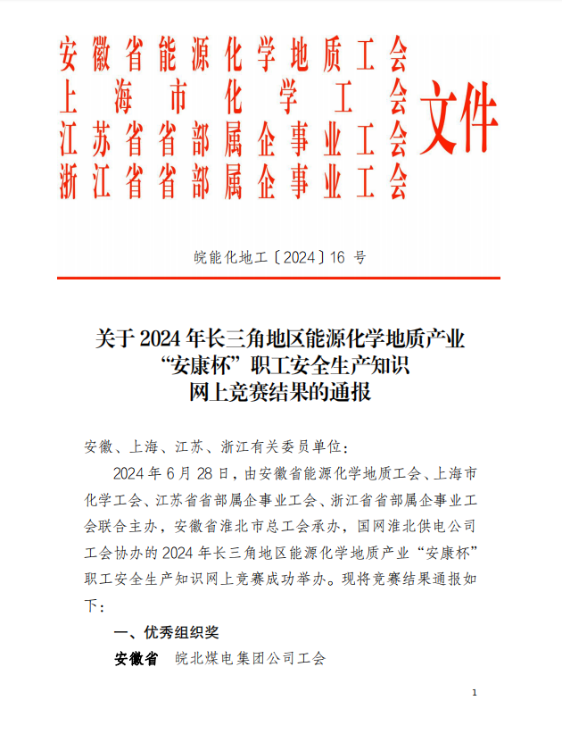 近日,省能源化学地质工会印发《关于2024年长三角地区能源化学地质产业“安康杯”职工安全生产知识网上竞赛结果的通报》,我院职工延海涛荣获个人二等奖。