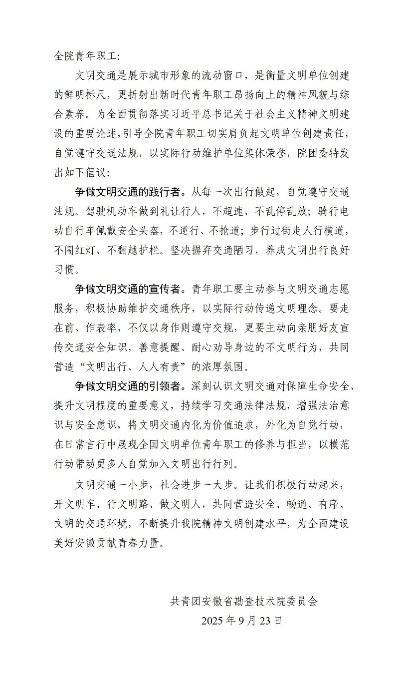 共青团安徽省勘查技术院委员会关于文明出行的倡议书
